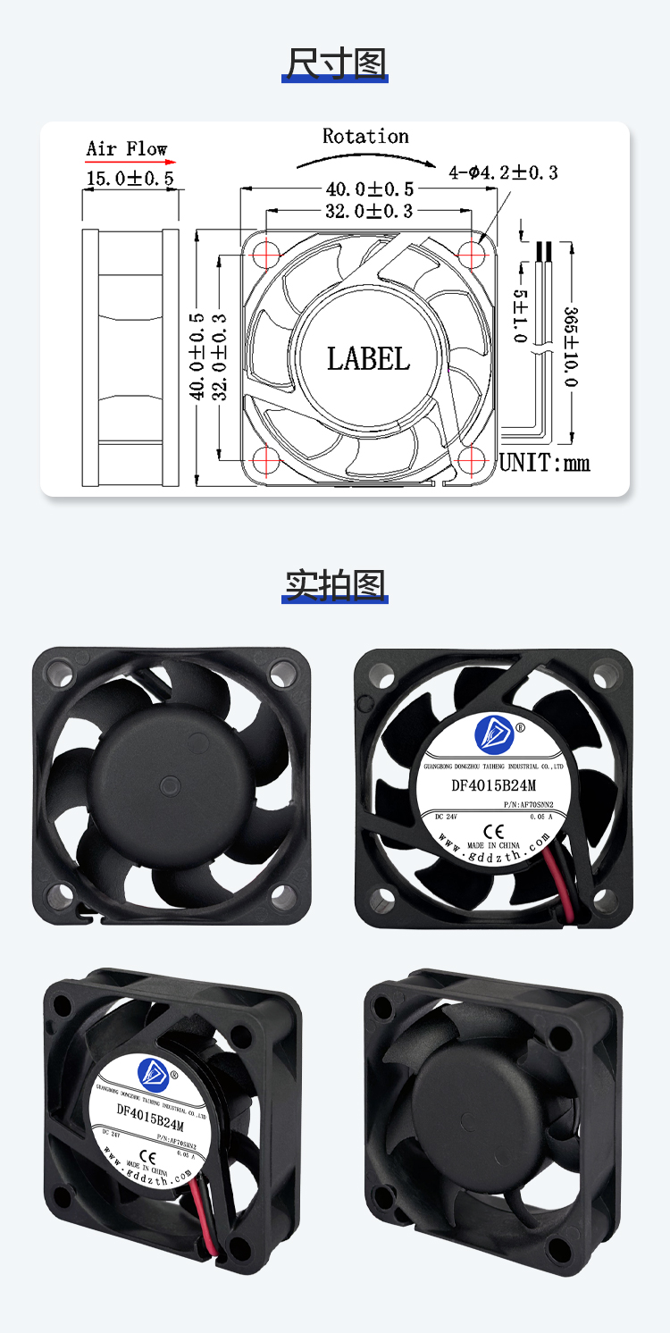 4015直流散热风扇尺寸为:40*40*15mm,框叶采用环保防火PBT复合材料,硬度更强、韧性更足,具有抗震动、防脆化、不变形等特点。轴承采用高精度、长寿命、低噪音、低发热双滚珠轴承,寿命比普通轴承长1.5~2.3倍。电机采用五代升级直流无刷高导铜电机与高效控制方案,在寿命、发热、功耗、电流冲击、负载等方面表现优异。适用于:电源电器、通讯设备、医疗设备、充电机、自动化等设备散热使用